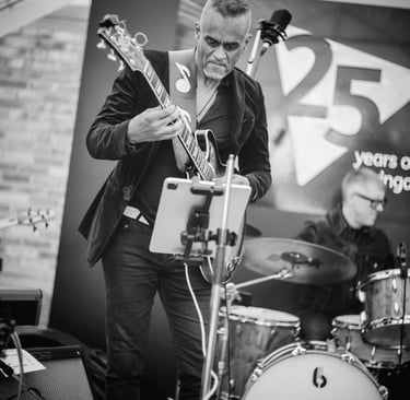 is an accomplished guitarist, musical director, and producer whose career spans international touring, recording, and musical education. A graduate of Goldsmiths College, University of London, with a Certificate in Jazz and Popular Musicianship, he also holds an HNC in Studio Engineering, giving him a deep technical and creative understanding of both performance and production.